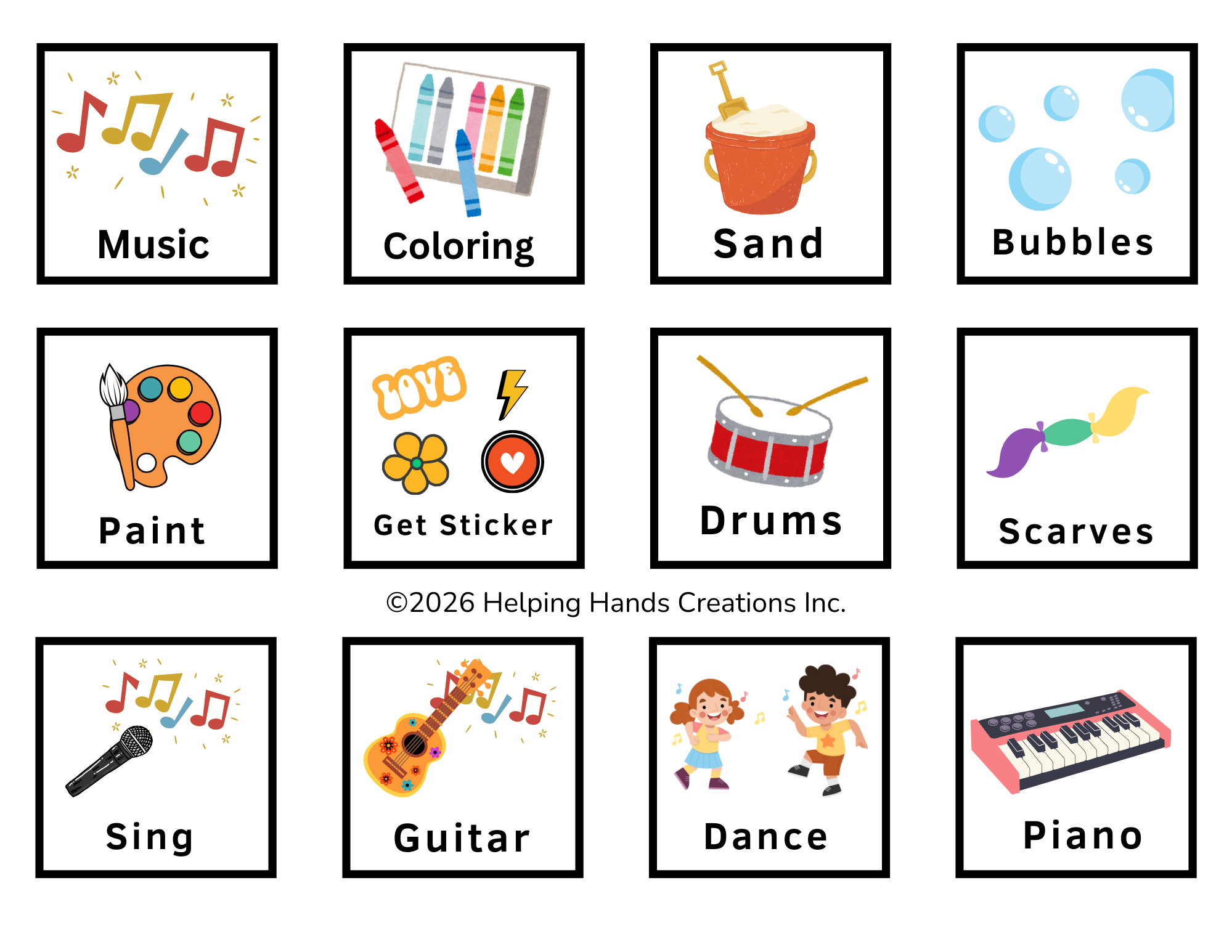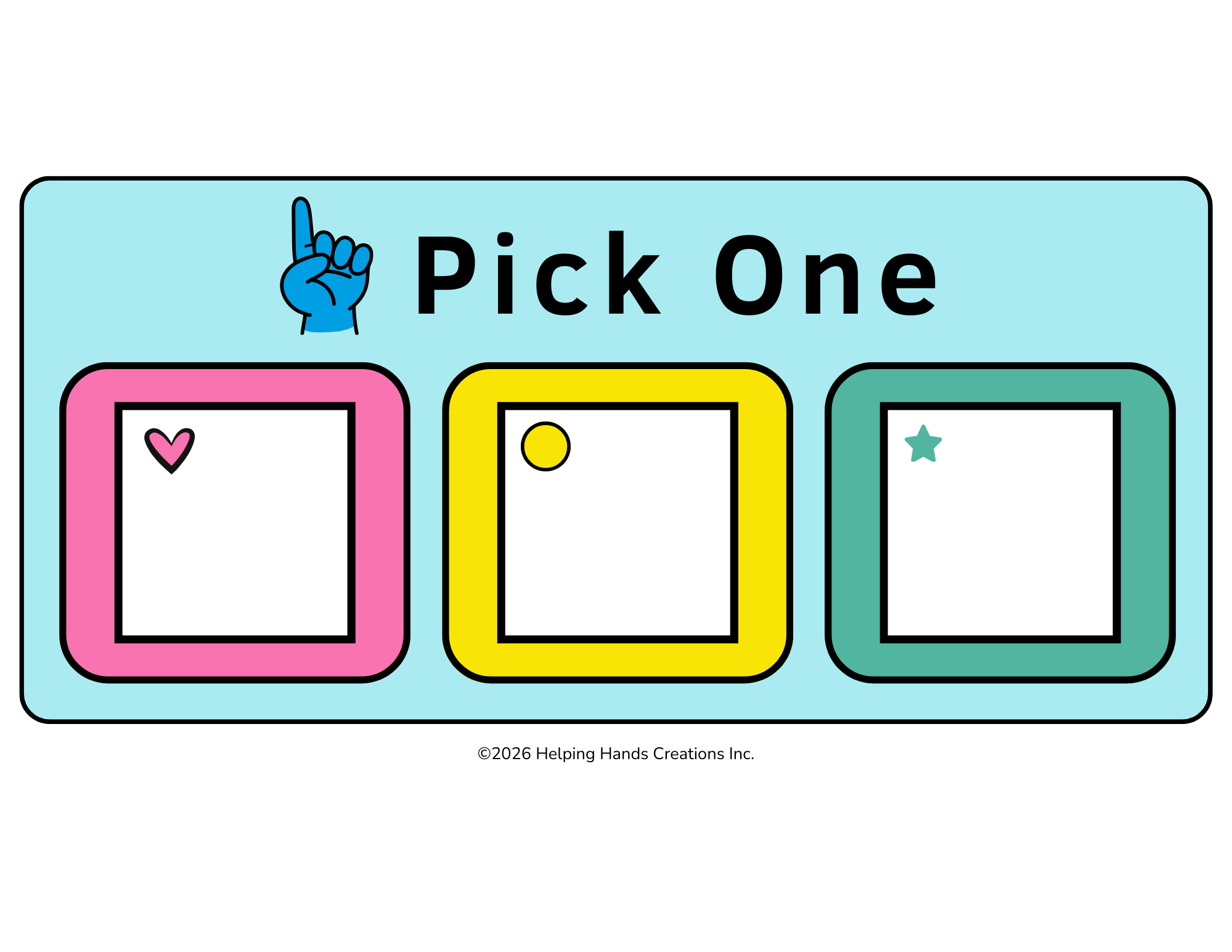 This optional board allows the child to pick the next event from several options. This is a great way to encourage transitions from one fun activity to the next. I personally recommend activities involving: toys, movement, music, or art.