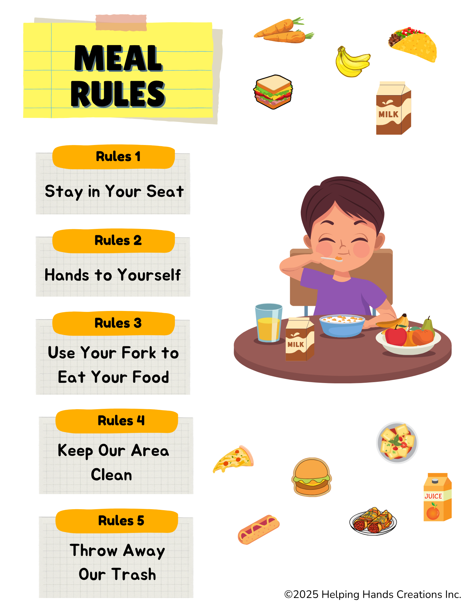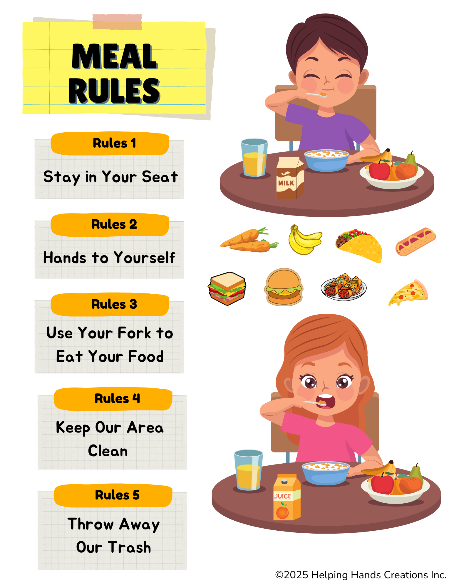 This focus board needs to be next to the student as they are eating. Redirect student as needed and have them repeat the rule that needs reminding.
