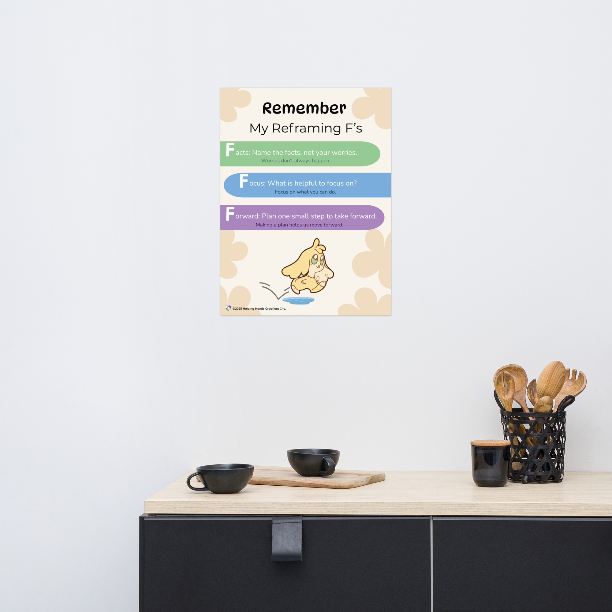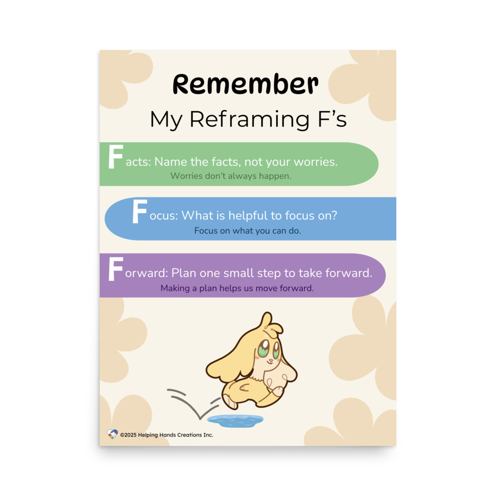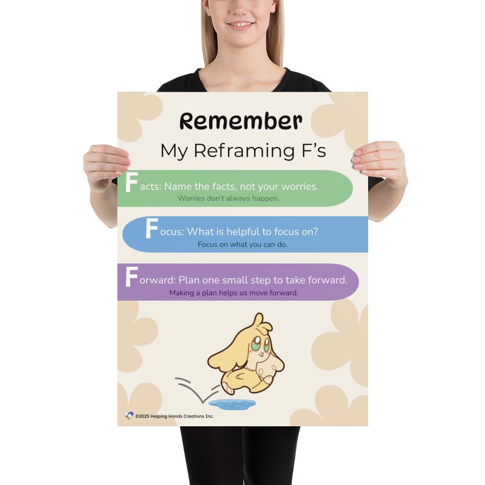 When we encounter big feelings, our worries can fill us with anxiety and fear. With our Gentle Reframing Poster, we break down the Reframing technique into 3 easy-to-remember steps: Facts, Focus, and Forward.