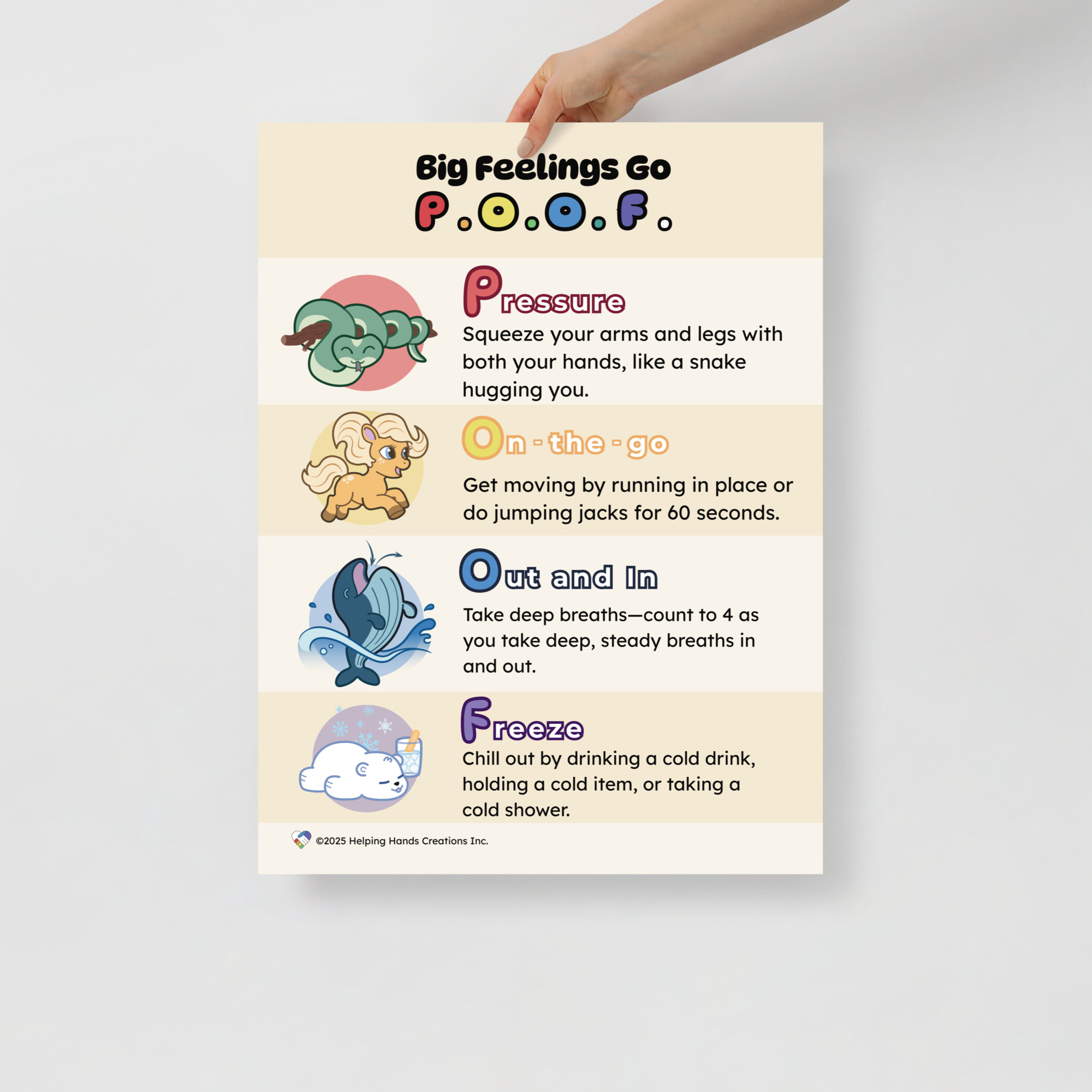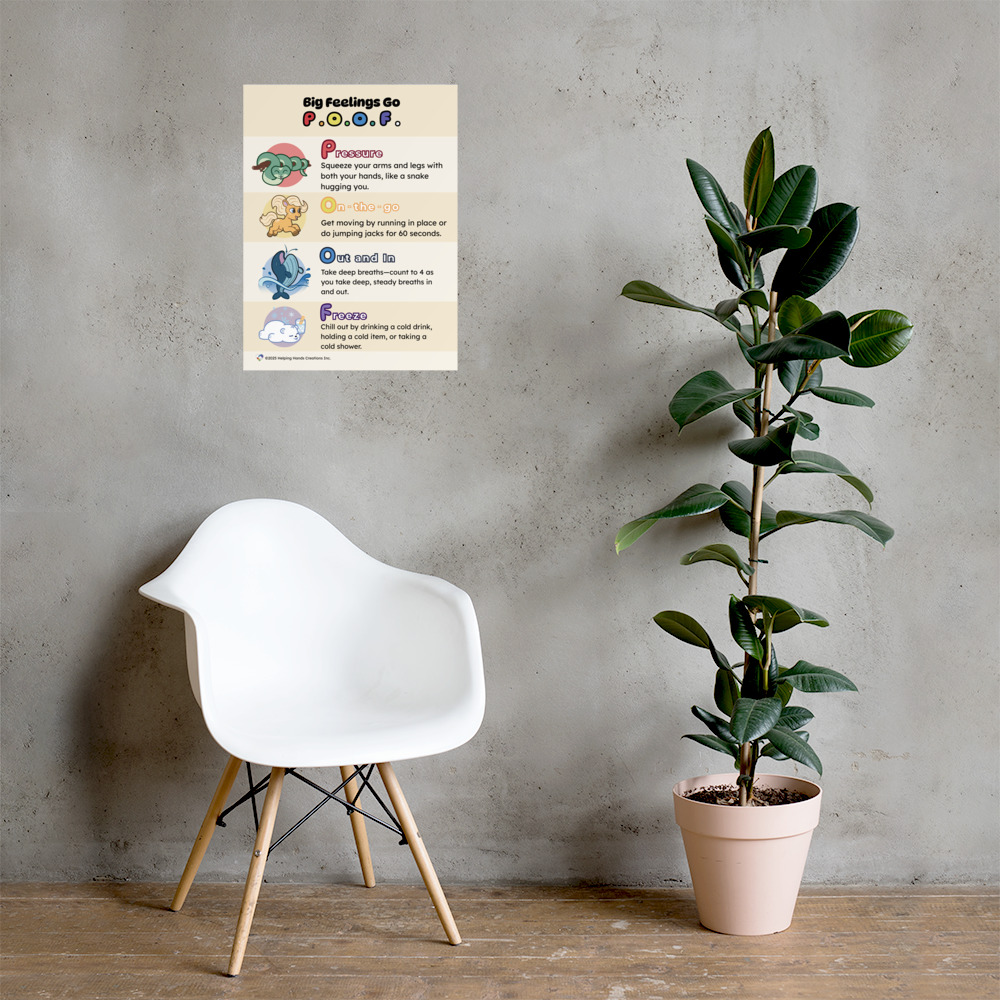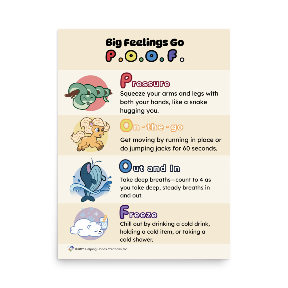 This memorable poster gives concrete strategies for emotional regulation. By using our fun, easy to remember POOF method, you can encourage how to safely manage big feelings with young loved ones.