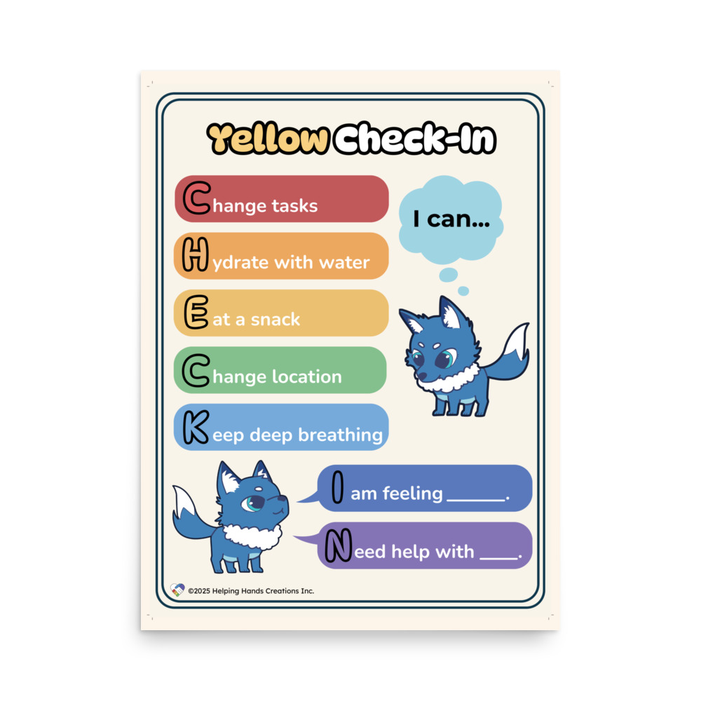 To go along with the 4 Emotional Regulation Zones Poster (also known as the 4 color zones), we created a Check-In Station Poster! This poster describes strategies for children to use once they enter the “blue, yellow, or red” zones. Once a child expresses feeling dysregulated, they are encouraged to “check-in” and follow the poster’s strategies.
