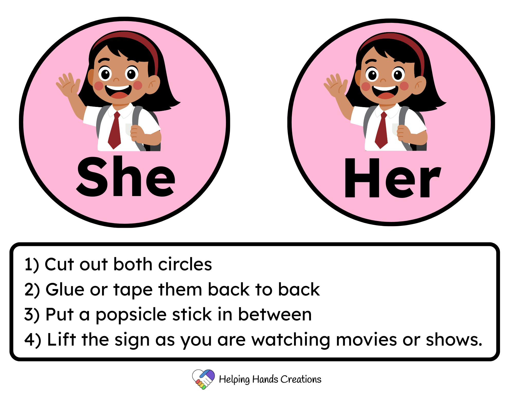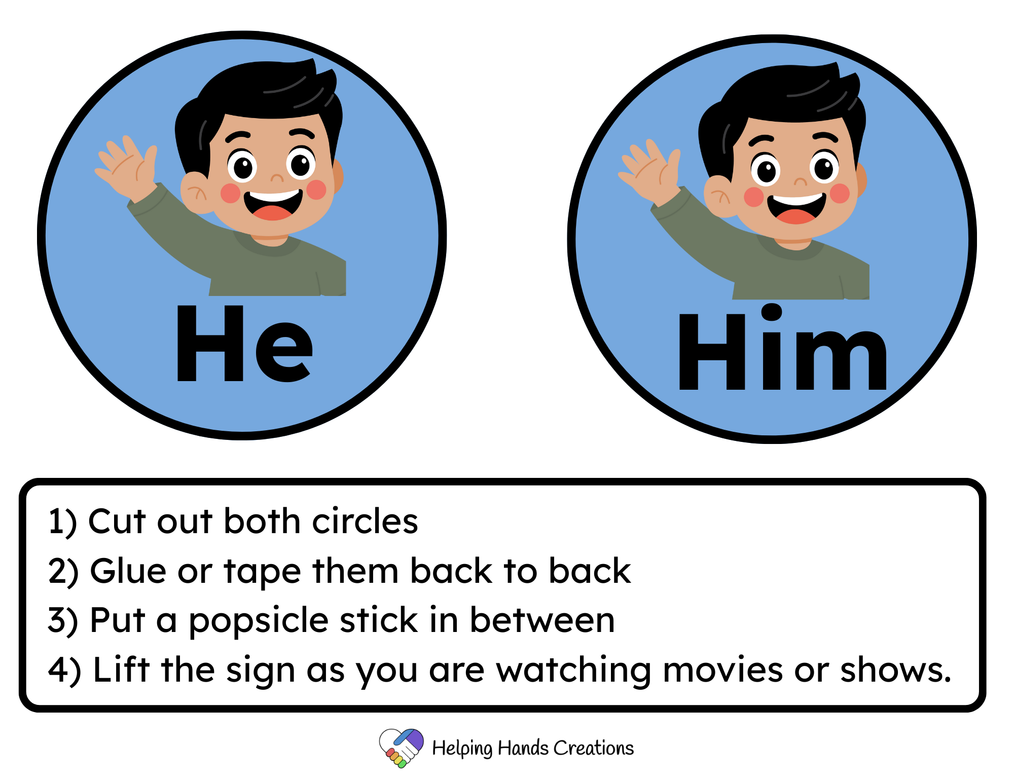 We made Pronoun Signs that your little one can lift to describe characters on the screen.